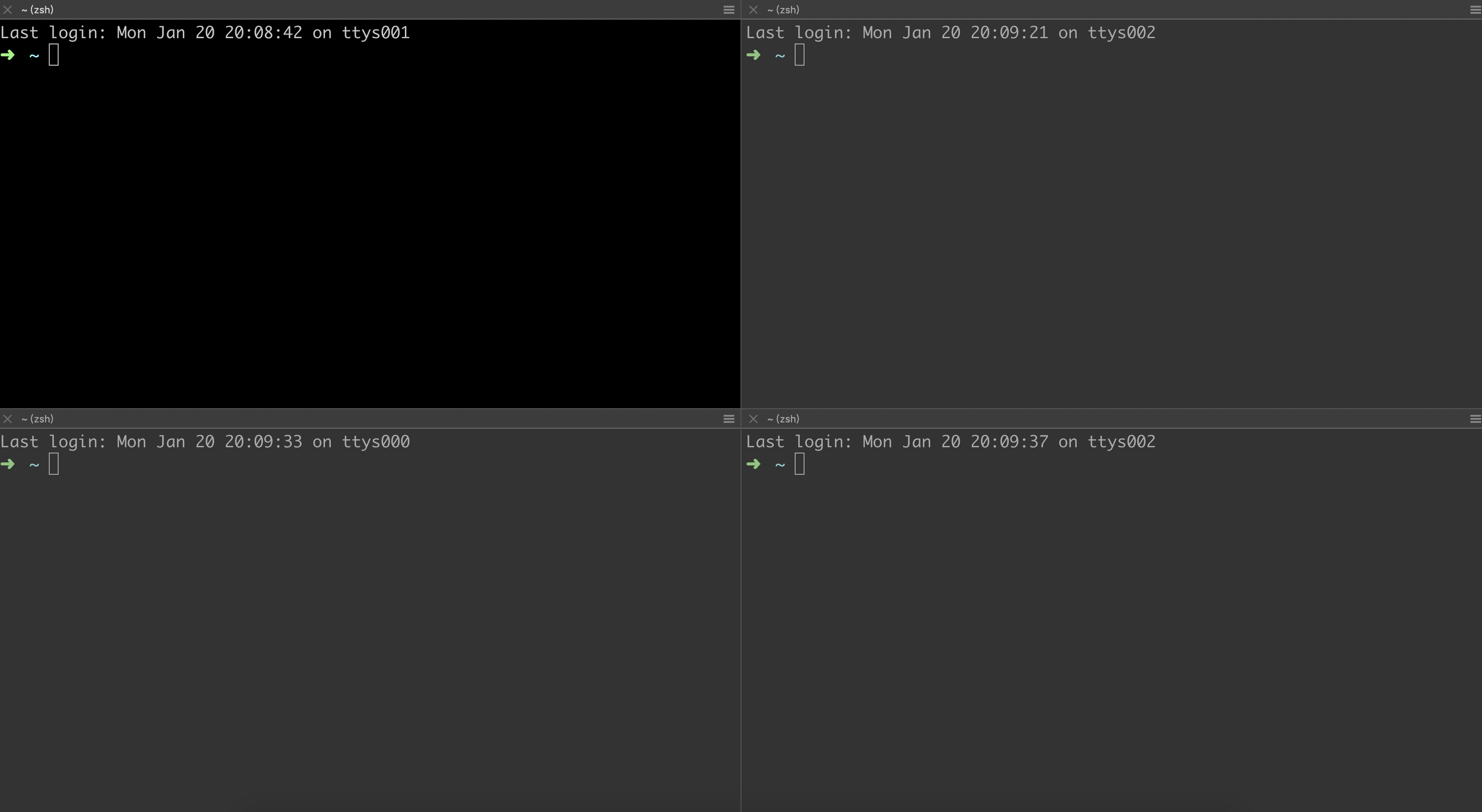 如果用默认的 Terminal,则不支持分屏,需要单独开四个窗口。