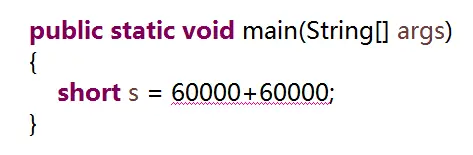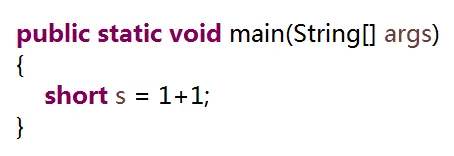 这次赋值操作,“=”右边的算术表达式中并没有出现变量,但是仍然会报语法错误,原因就是,编译器会提前把算术表达式的值算出来,如果发现算出来的值已经超过了byte或short的数据范围,也会报错。因此第4段程序也不能通过编译。