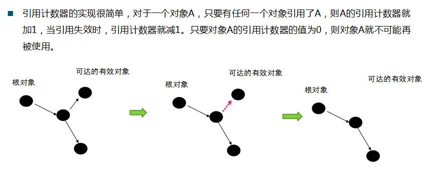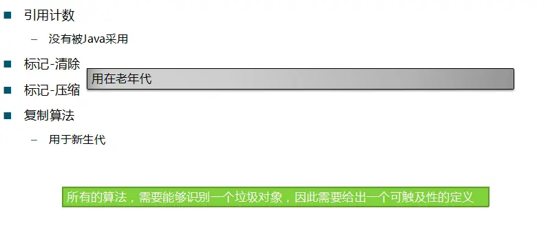 标记清除:标记-清除算法是现代垃圾回收算法的思想基础。标记-清除算法将垃圾回收分为两个阶段:标记阶段和清除阶段。一种可行的实现是,在标记阶段,首先通过根节点,标记所有从根节点开始的可达对象。因此,未被标记的对象就是未被引用的垃圾对象。然后,在清除阶段,清除所有未被标记的对象。