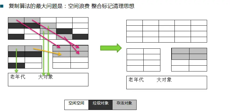 复制算法:与标记-清除算法相比,复制算法是一种相对高效的回收方法 不适用于存活对象较多的场合 如老年代 将原有的内存空间分为两块,每次只使用其中一块,在垃圾回收时,将正在使用的内存中的存活对象复制到未使用的内存块中,之后,清除正在使用的内存块中的所有对象,交换两个内存的角色,完成垃圾回收