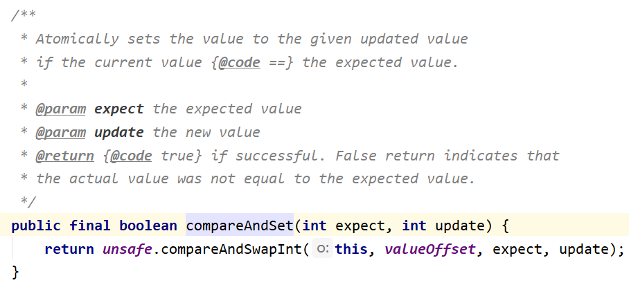boolean compareAndSet(int expect, int update) expect期望值,update更新值,有且仅有期望值和内存中的值相等时,才会把内存中的值修改为更新值。