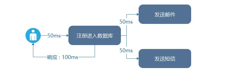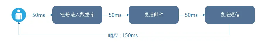 假设现在用户需要注册一个账号,注册完成后需要发送注册邮件和短信提示,如果让整个流程按照串行化执行,从注册到系统响应共计150ms。