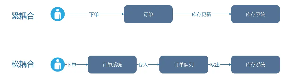 如果不适用消息队列直接让订单系统依赖于库存系统,则会出现二者任意一个崩溃整个系统都无法使用,而在加入消息队列后,如果库存系统崩溃,用户依旧可以正常下单,只是这些订单将存储在订单队列中,待库存系统修复后可从队列中获取进行业务处理,让整个系统更加安全,依赖程度更低。