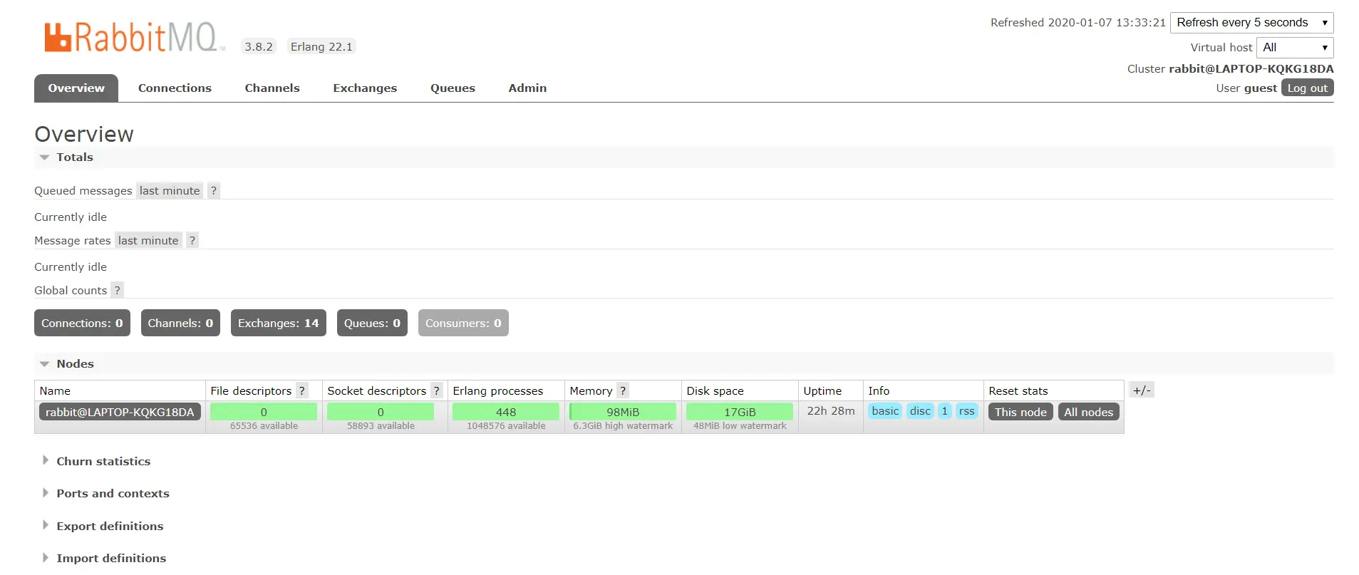 安装完成之后,打开默认RabbitMQ-Server分配的地址localhost:15672,默认密码和用户名都为guest。