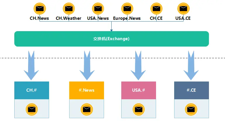 如图,其中以CH开头的消息都会发送到CH.#消息队列中,以.News结尾都会发送到#.News消息队列中,以此类推。