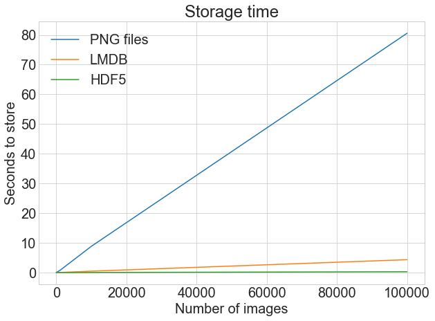 当你将图像存储为.png文件时,写入时间和读取时间有很大的区别。然而,对于LMDB和HDF5,这种差别就不那么明显了。总的来说,即使读取时间比写入时间更重要,使用LMDB或HDF5存储图像也有充分的理由。