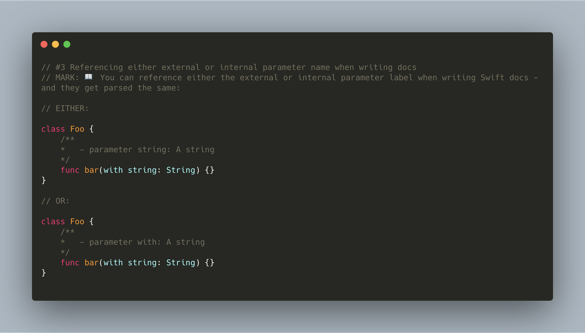 但 Swift 提供了这个特性后,注释文档的书写变得更友好,也更灵活。