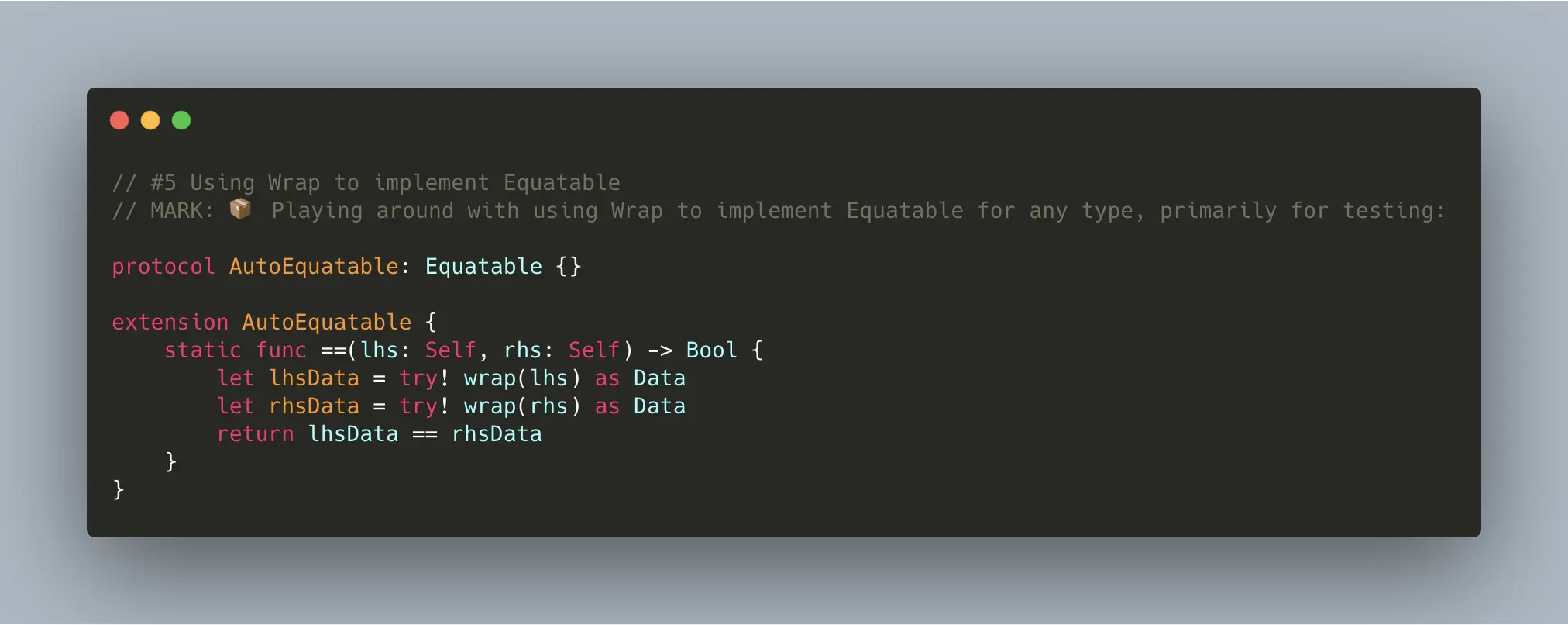 图片里的代码就是利用 protocol & extension 这种形式,为所有遵循此协议的类型提供了一个默认的 Equatable 实现,只需要遵守此协议就可以使用 Equatable 了。