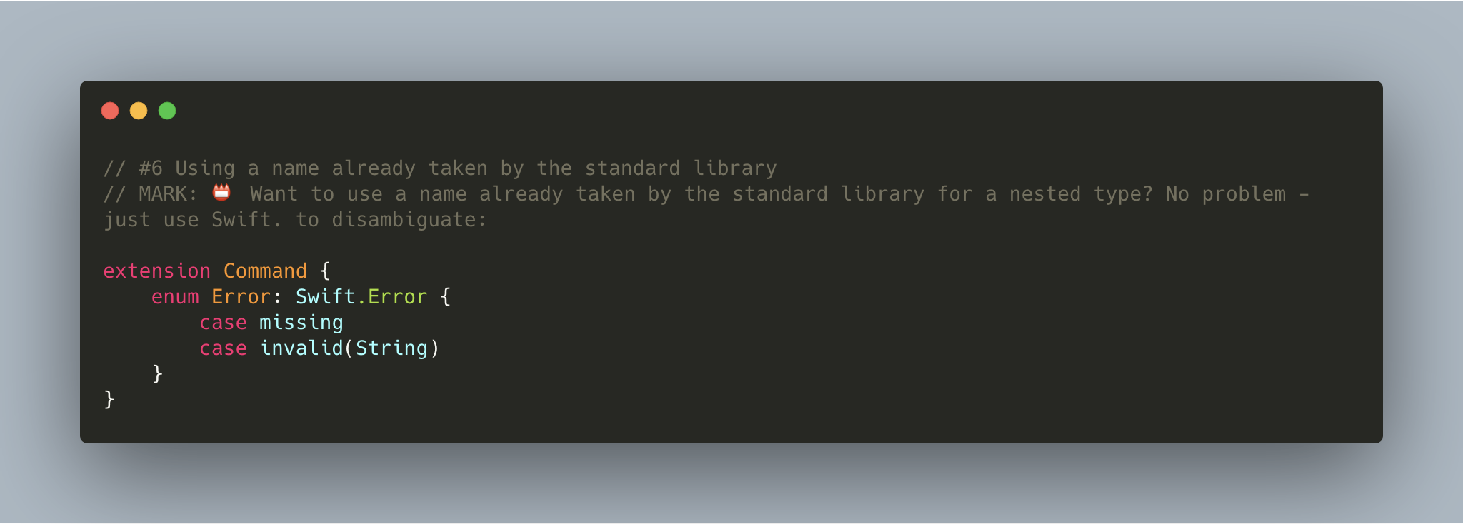 这种方案虽然解决了问题,但不够优雅,主要是在类型的命名上,当我们要引用 Command 里面的这个内嵌类型时,我们会怎么写代码呢,必定是 Command.CommandError.missing ,看到这似乎嗅到了一点点 Objective-C 那又臭又长的命名味道,那么有更好的解决方案么?