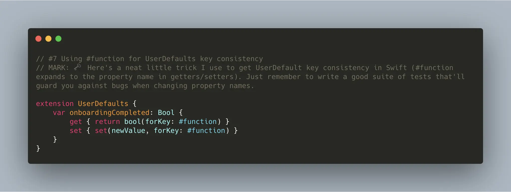 说好处之前,我们先想想,如果不用 #function 的话,我们会怎样从 UserDefaults 里取 key 值呢?八成你的代码会如下所示: