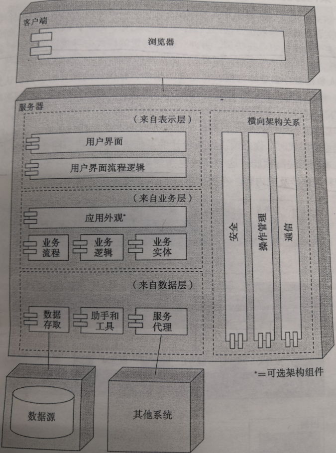 看参考图,这个参考架构创建了这类应用的主层--界面层、业务层和数据层,层内的元素类型和这些元素的职责,如UI组件、业务组件、数据访问组件此外还提供了一些需要加以解决的横向关注点,如安全和通信。