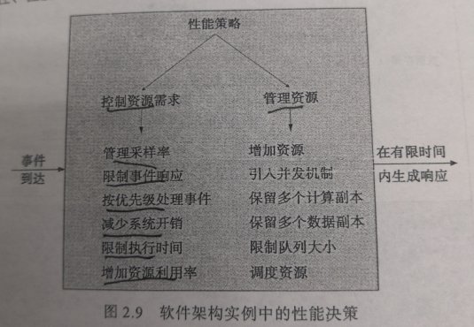 策略是会影响质量属性响应控制的设计策略。例如,如果想要设计一个低延迟或者高吞吐量的系统,可以定制一组设计决策,充当即将到来的事件(服务),产生的反应带有时间约束条件。