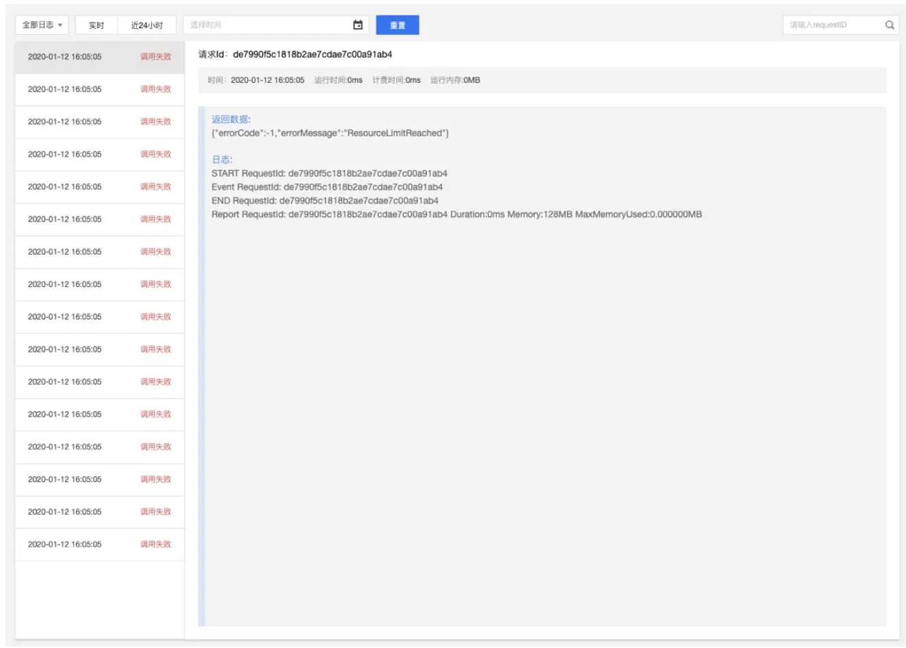 到函数执行日志查看失败原因,发现是资源限制,目前腾讯云还未给出解释。