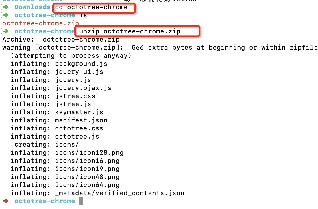 - 打开命令行,进入到 octotree-chrome 文件夹中,并解压插件文件 octotree-chrome.zip