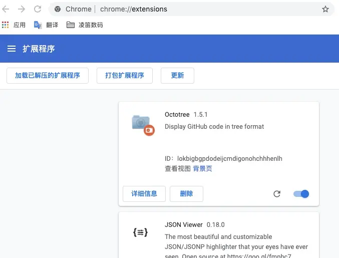 - 打开 chrome浏览器,打开插件管理页面,chrome://extensions/,将上面解压的 octotree-chrome 文件夹拖入到界面中即可。