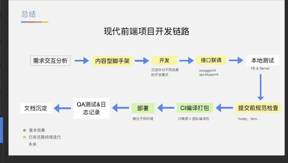然后在自己答辩的 Slides 中有个模块,主要就是前端工程化的贡献,包含脚手架,研发模式,接口管理等比较基础的涉足,和当时该模块核心讲编译部署流程的优化,在整个部门的四五个团队均有落地。