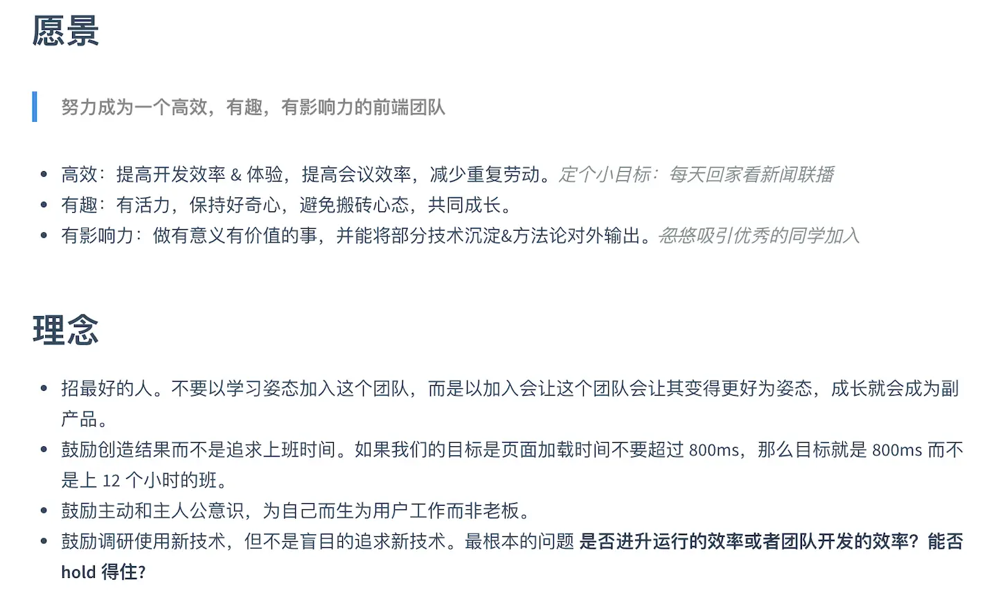 - 愿景: 一个公司有一个公司的灵魂,而一个团队也需要有一个团队的目标,否则只是一堆人的聚合体。怀着以上理念,在团队介绍的下面敲下了几句话。兴许幼稚,兴许不一定所有新人都能看得懂,但这就是目前心中理想中团队该有的样子。