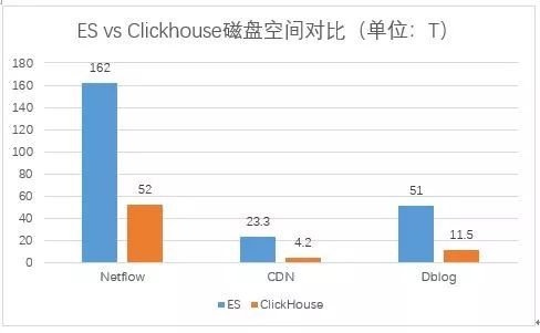 相比ES,ClickHouse后至少可以节省60%的磁盘空间。如下图所示,Netflow 的日志占用的磁盘空间ClickHouse是ES的32%,CDN日志占用磁盘空间ClickHouse是ES的18%,Dblog的日志ClickHouse是ES的22.5%。