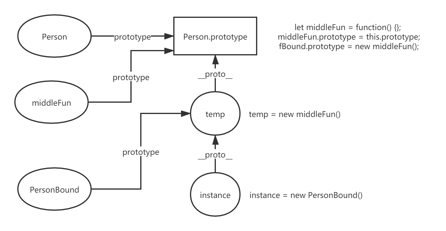 let instance = Object.create(fBound.prototype); //模拟new调用,让instance的__proto__指向FBound.prototype