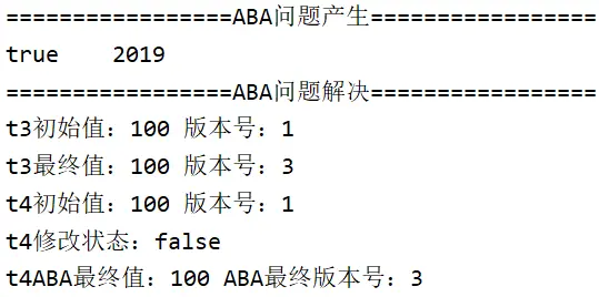 System.out.println(Thread.currentThread().getName()+"ABA最终值:"+stampedReference.getReference() + " ABA最终版本号:"+stampedReference.getStamp());