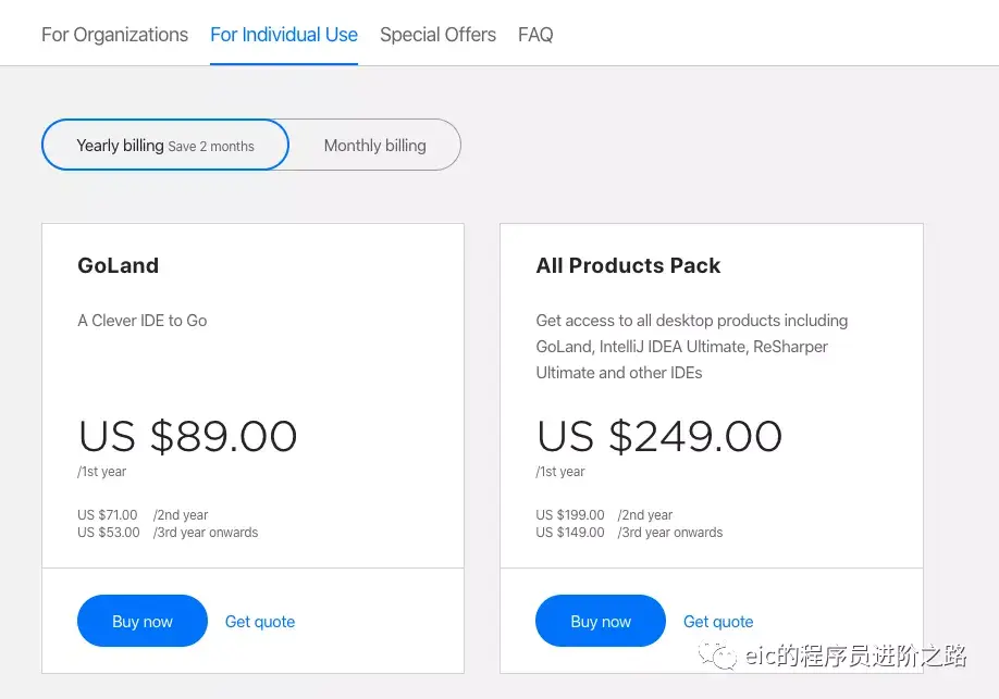 Jetbrains系列软件如Intellij,Pycharm, Goland, Webstorm等有口皆碑,它们功能强大,具有相似的操作习惯,在程序员中非常流行,然而Jetbrains是付费软件,价格贵的惊人。下图是官网的费用截图: