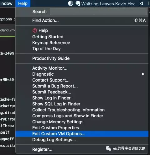 修改配置文件,”Help | Edit Custom VM Options", 如下图所示:
