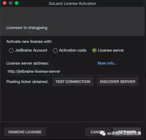 重启Idea之后,点击菜单栏中的 “Help | Register …”,选择 "License server", 地址填入:http://jetbrains-license-server(应该会自动填上),或者点击按钮:”Discover Server”来自动填充地址,完成激活。