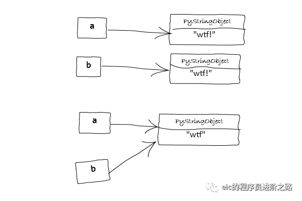 当在同一行将 a 和 b 的值设置为 "wtf!" 的时候, Python 解释器会创建一个新对象, 然后同时引用第二个变量(译: 仅适用于3.7以下, 详细情况请看这里). 如果你在不同的行上进行赋值操作, 它就不会“知道”已经有一个 wtf! 对象 (因为 "wtf!" 不是按照上面提到的方式被隐式驻留的). 它是一种编译器优化, 特别适用于交互式环境.