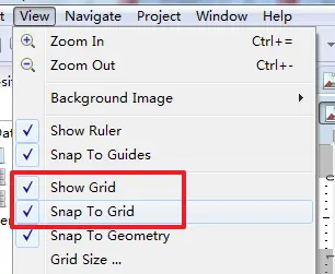 默认会在背景中展示 Grid 的小格子,这可以在 View -> Show Grid 中进行控制。默认会让元素紧贴着这些小格子,这可以在 View -> Snap to Grid 中进行控制。