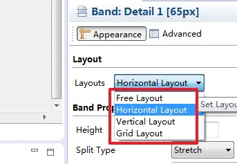 - 先选择某个容器,然后在相应容器的 Properties 面板中,Appearance->Layout 中进行下拉选择即可: