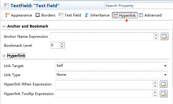图片、text field 或者图表元素的属性中,都有一个 Hyperlink 标签页。