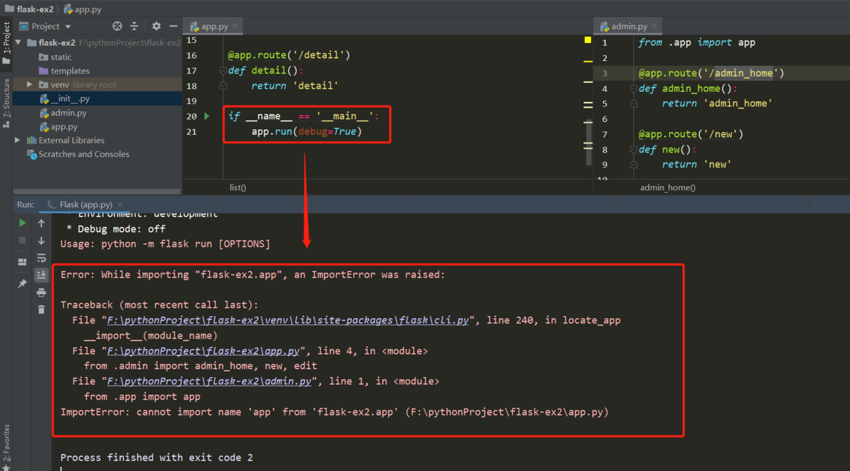 尝试用模块导入的方式解决: 我们把上述一个py文件的多个路由视图函数给拆成两个文件:app.py和admin.py文件。app.py文件作为程序启动文件,因为admin文件没有应用程序实例app,在admin文件中要使用app.route路由装饰器,需要把app.py文件的app导入到admin.py文件中。