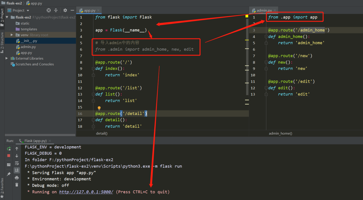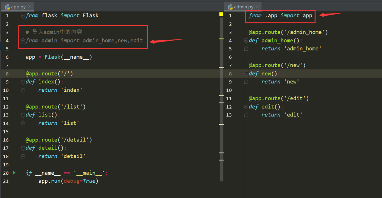 1. 当app.py需要导入admin.py中某些视图函数的时候,admin.py也需要导入app.py中的app实例,用来设置路由。