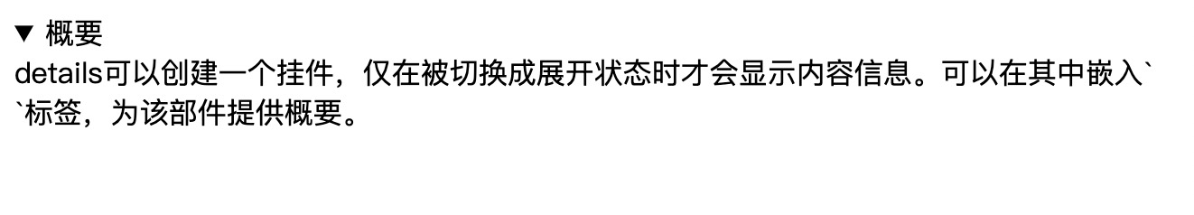 details可以创建一个挂件,仅在被切换成展开状态时才会显示内容信息。可以在其中嵌入<summary>标签,为该部件提供概要。