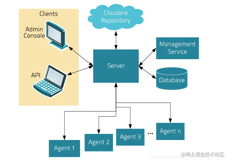 Database:存储配置和监视信息。通常情况下,多个逻辑数据库在一个或多个数据库服务器上运行。例如,Cloudera的管理服务器和监控角色使用不同的逻辑数据库。
