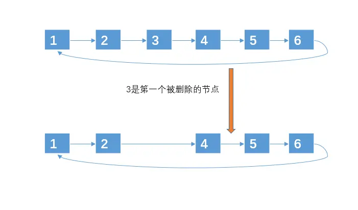 学过链表的人,估计都会用链表来处理约瑟夫环问题,用链表来处理其实和上面处理的思路差不多,只是用链表来处理的时候,对于被选中的编号,不再是做标记,而是直接移除,因为从链表移除一个元素的时间复杂度很低,为 O(1)。当然,上面数组的方法你也可以采用移除的方式,不过数组移除的时间复杂度为 O(n)。所以采用链表的解决方法如下: