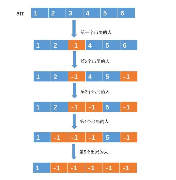 用一个数组来存放 1,2,3 ... n 这 n 个编号,如图(这里我们假设n = 6, m = 3)
