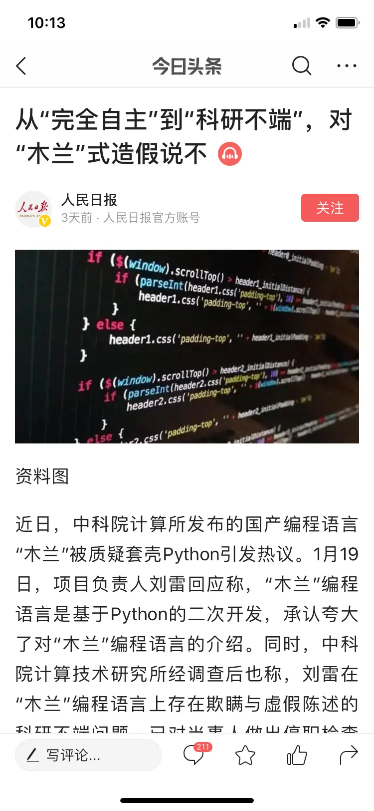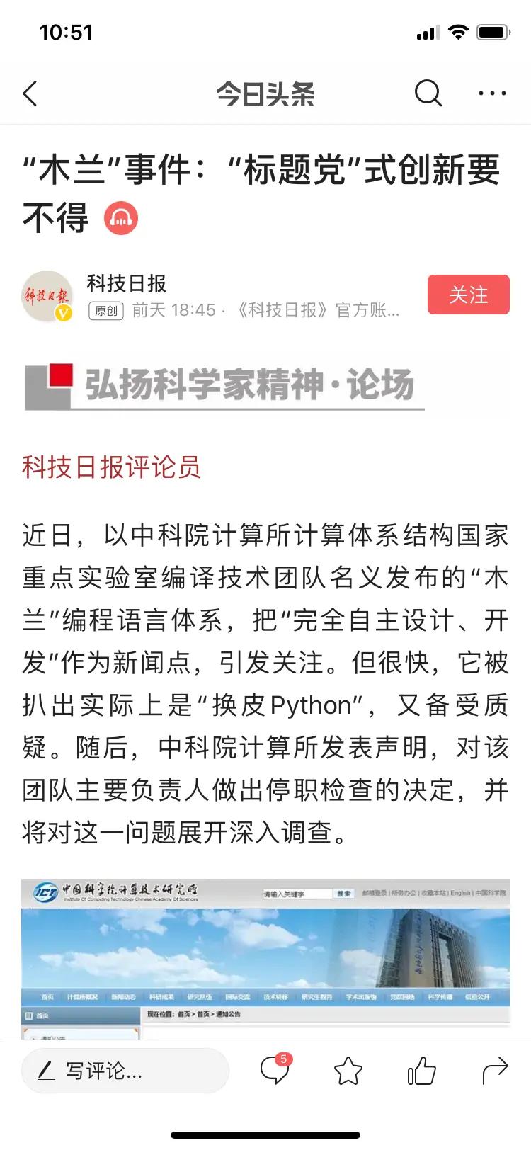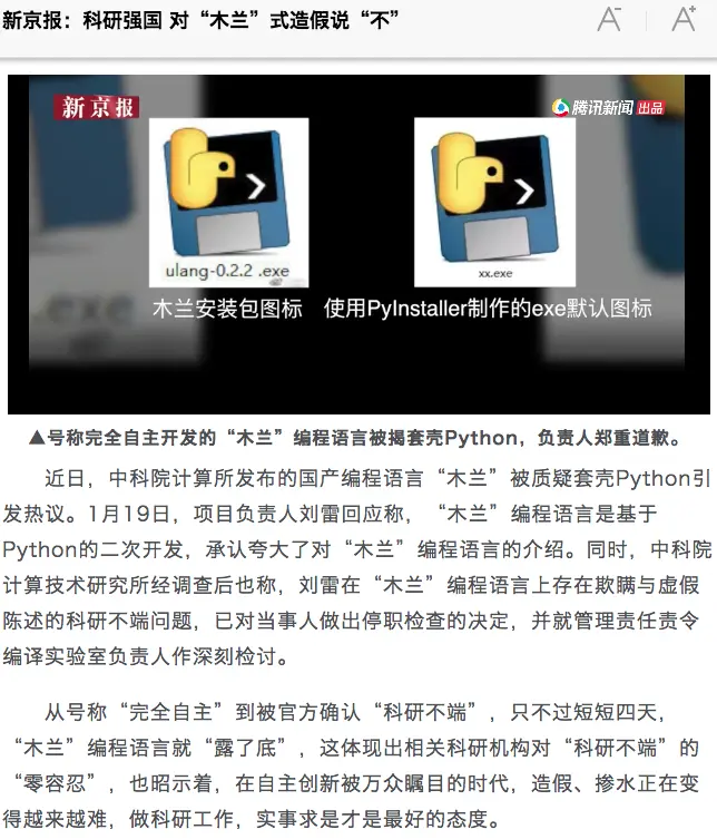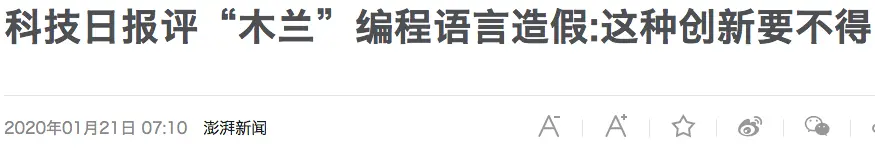 有趣的是,我在 20 日发表了《为什么要急着为「木兰」编程语言贴上“造假”的标签?》一文。21 日早上,科技日报的标题还有“造假”的字眼,