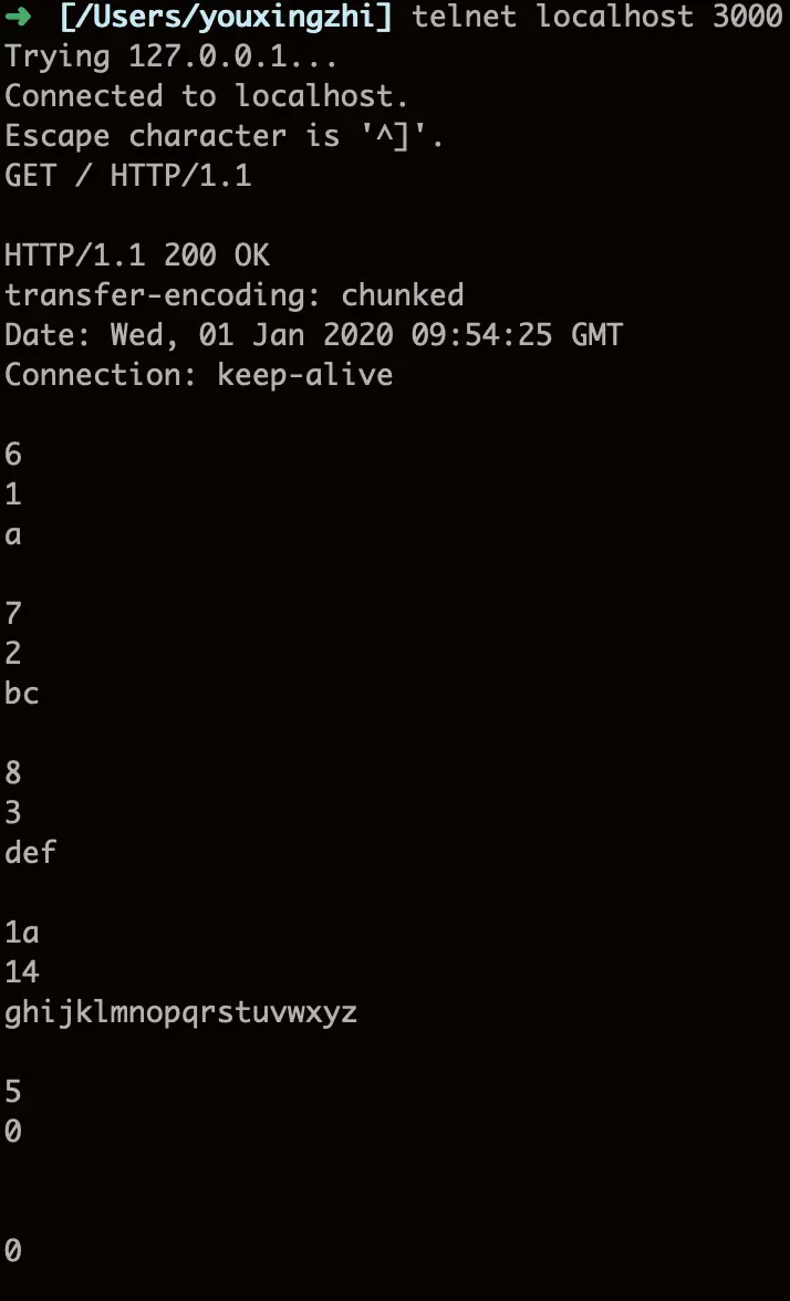 从结果中发现,传入 res.write 的参数都被当做了 chunk 的内容,通过 telnet 调试发现确实如此: