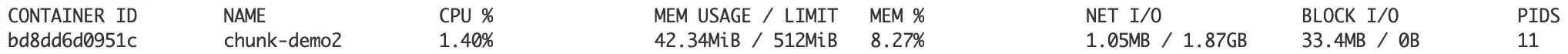 通过 docker stats chunk-demo2 监控容器的运行状态,发现内存使用率一直维持在一个较小的水平:
