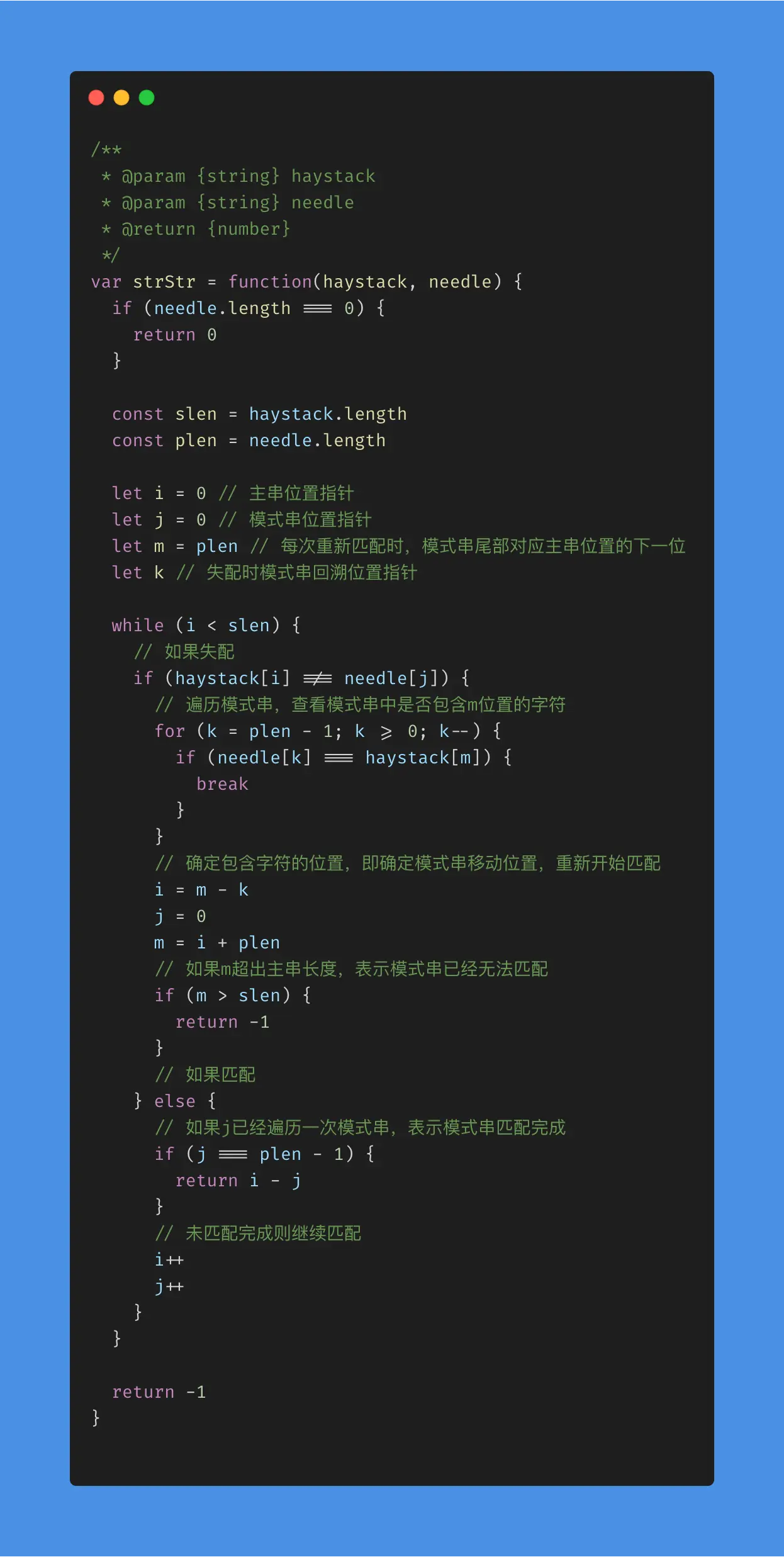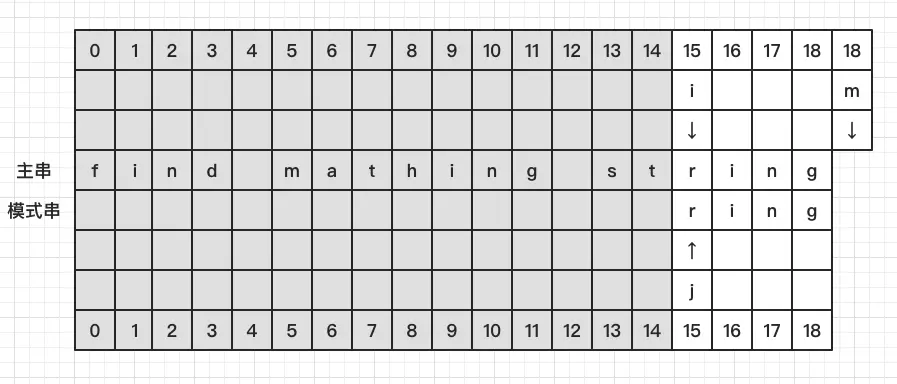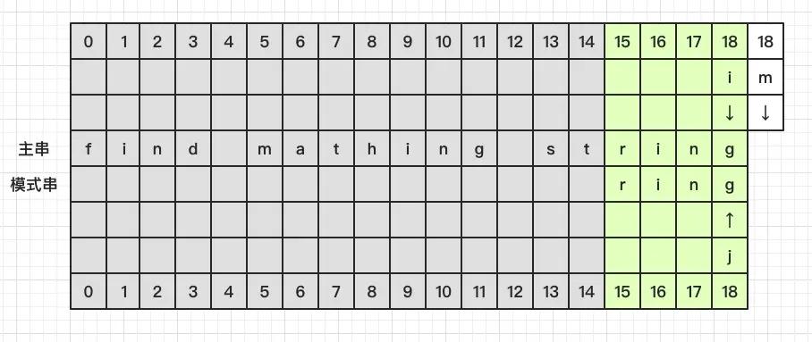 继续匹配,直到 j === plen - 1 = 3,则匹配成功,得到结果 i - j = 18 - 3 = 15