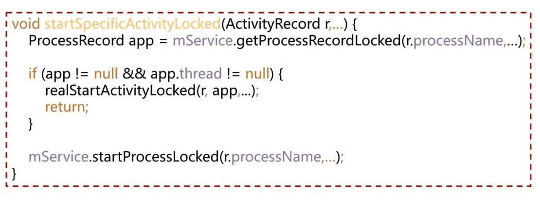 - AMS在回调函数onTransact中收到data和code。然后判断activity所在进程是否启动,并且是否向自己注册ApplicationThread。如果满足就调用realStartActivityLocked(),真正启动Activity,不满足先启动进程再启动Activity。