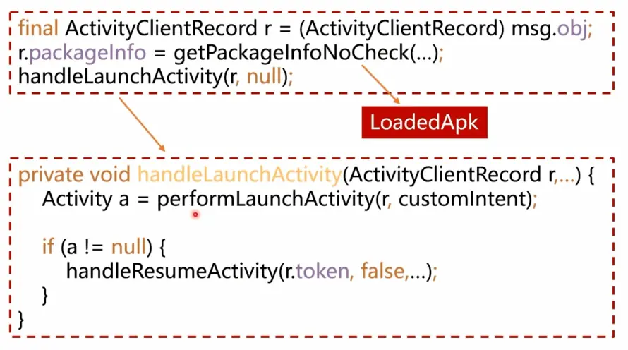 ActivityThread的performLaunchActivity方法,在这个方法里面进行activity的创建和生命周期的回调,这里调用了mInstrumentation.newActivity所以这里进行提换成我们插件的activity就可以,这里有个类加载器也必须使用插件的。