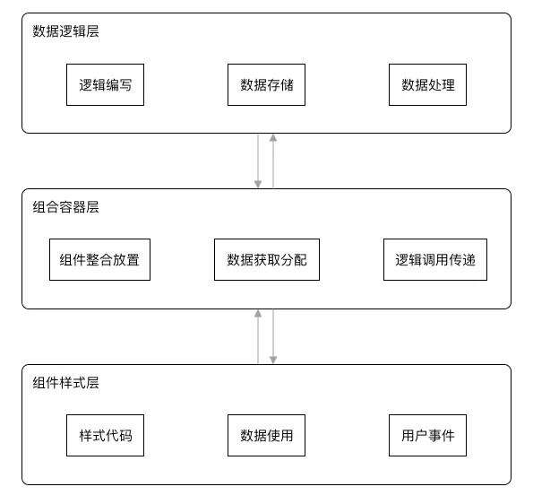 组合容器层:该层的主要功能是作为数据逻辑层与组件样式层的中间层进行调度管理,以合理的形式放置组件样式,并合理的将组件样式层所需的数据及相关逻辑操作从数据逻辑层取出进行传递。 细致分层结构: