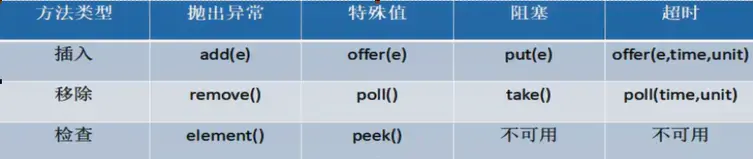 | 抛出异常 | 当阻塞队列满时,再往队列里面add插入元素会抛IllegalStateException: Queue full。当阻塞队列空时,再往队列Remove/element元素时会抛出NoSuchElementException。 |