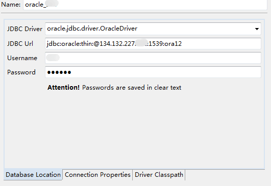 在 Database Location 页签中输入连接名、驱动名、URL、连接账号与密码: