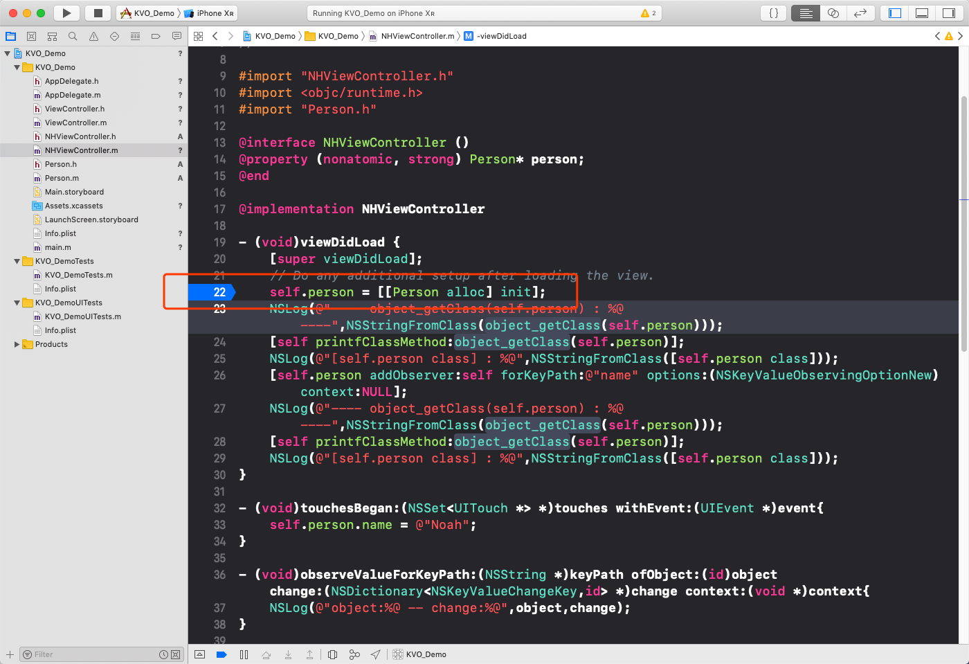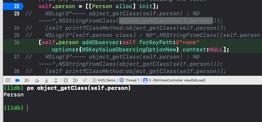 2020-01-22 18:48:39.121268+0800 KVO_Demo[3593:148194] ---- object_getClass(self.person) : Person ----