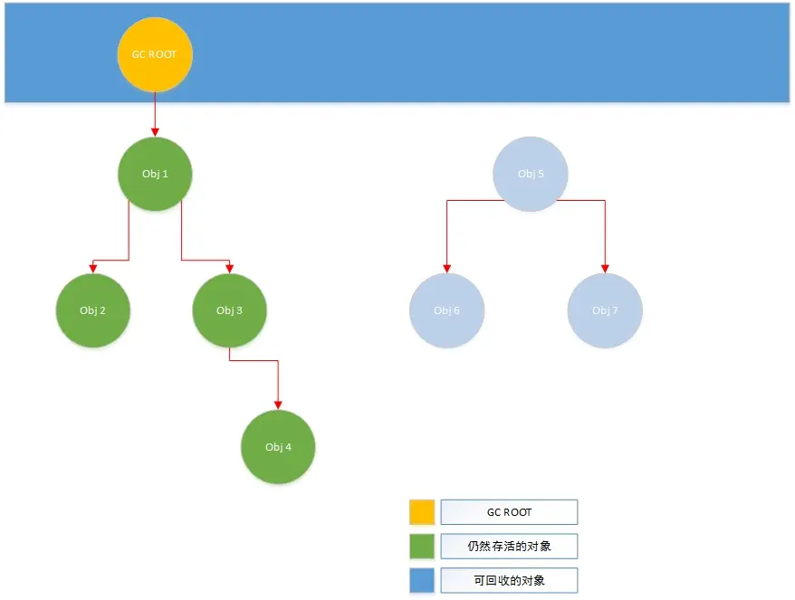 GC的第一步是需要搞明白,当前究竟有哪些对象是可以被回收的。由于引用计数法在存在循环引用时无法正常标记,所以一般是采用 可达性分析算法 来标记究竟有哪些对象可以被回收,如下图所示: