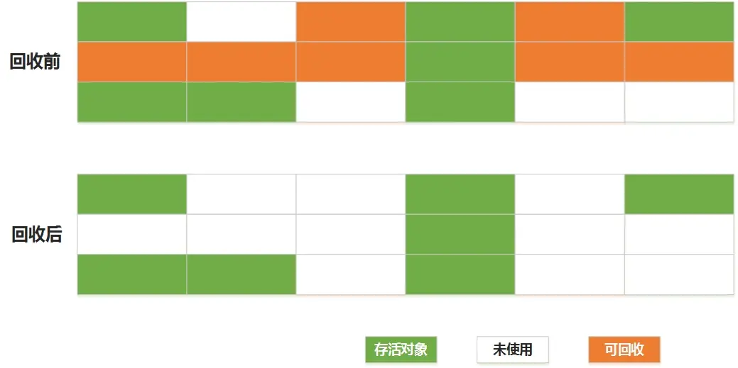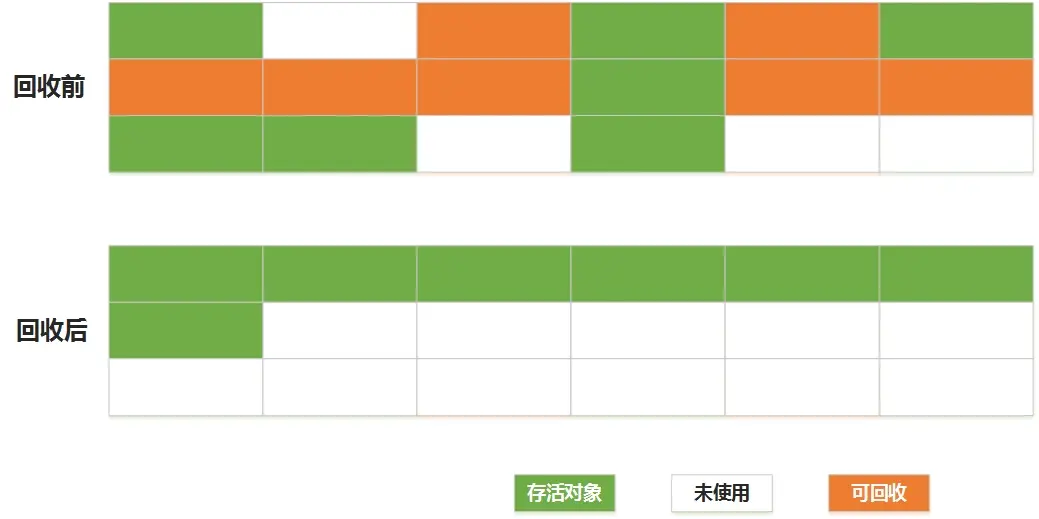 扫描一遍所有对象,并标记哪些可回收,然后清除,缺点是回收完会产生很多碎片空间,而且整体效率不高。