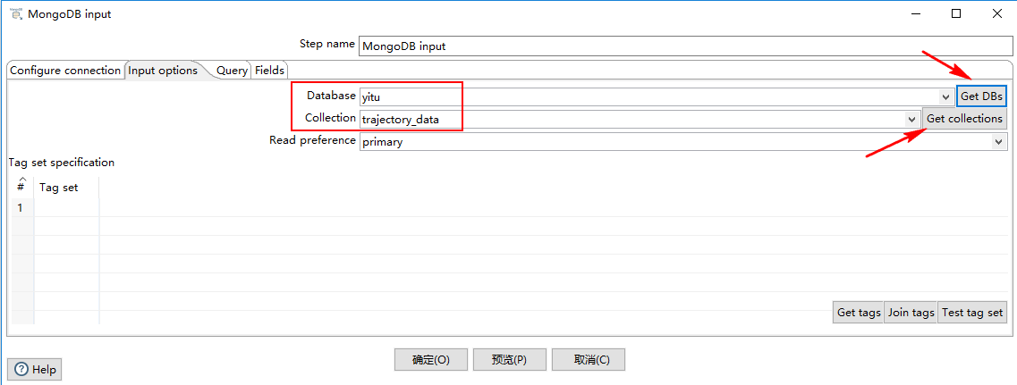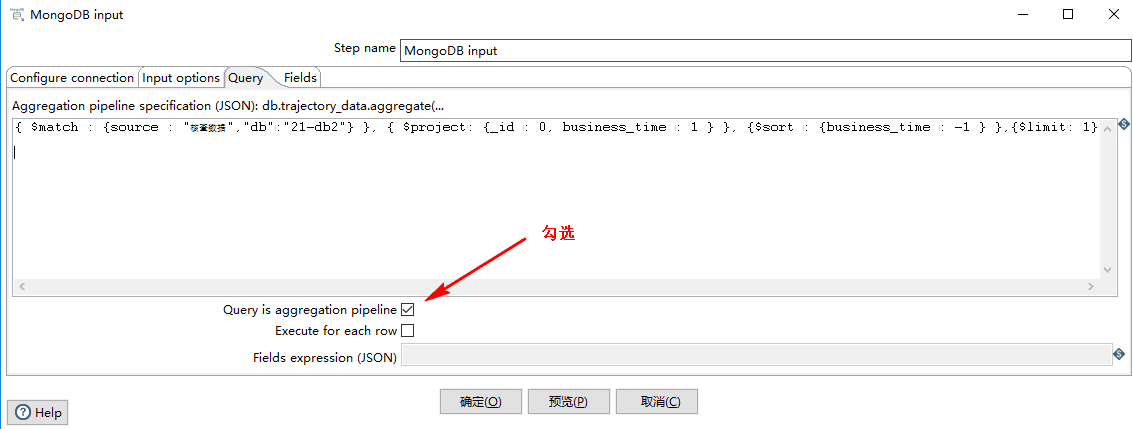 根据 source 和 db 字段来获取 bussiness_time 的最大值,Kettle 的 MongoDB 查询语句如下图所示: